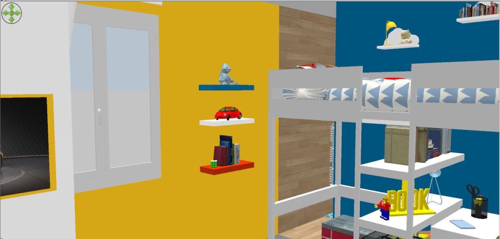 2 murs sont peints avec pour l’un, une teinte Jaune « soleil » , type Dulux Valentine Jaune limoncello 7 ou soleil 7 et pour l’autre une teinte Dulux Valentine Bleu Cobalt 6 ou 7